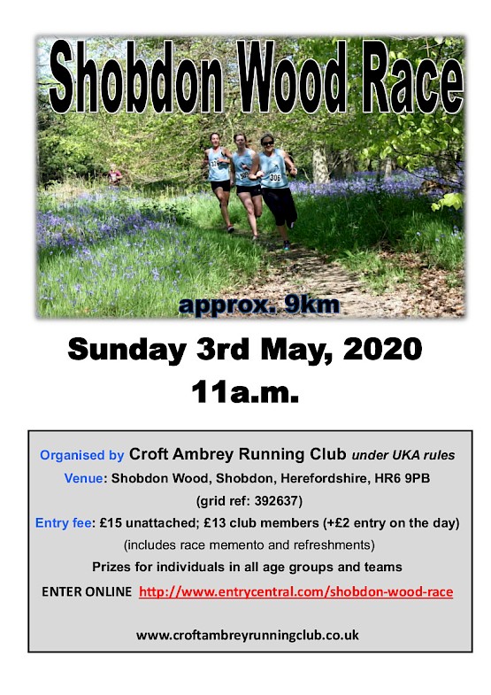 Shobdon Wood race is a completely off-road trail race along forest tracks and footpaths through Shobdon Wood, just one mile out of the village of Shobdon in North Herefordshire. It is approximately 11k with a few hills and stunning, far reaching views of Herefordshire, Shropshire and Mid Wales.